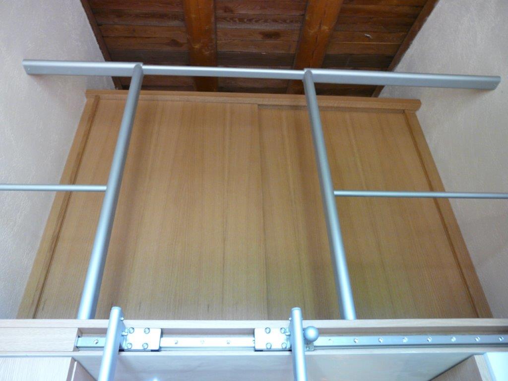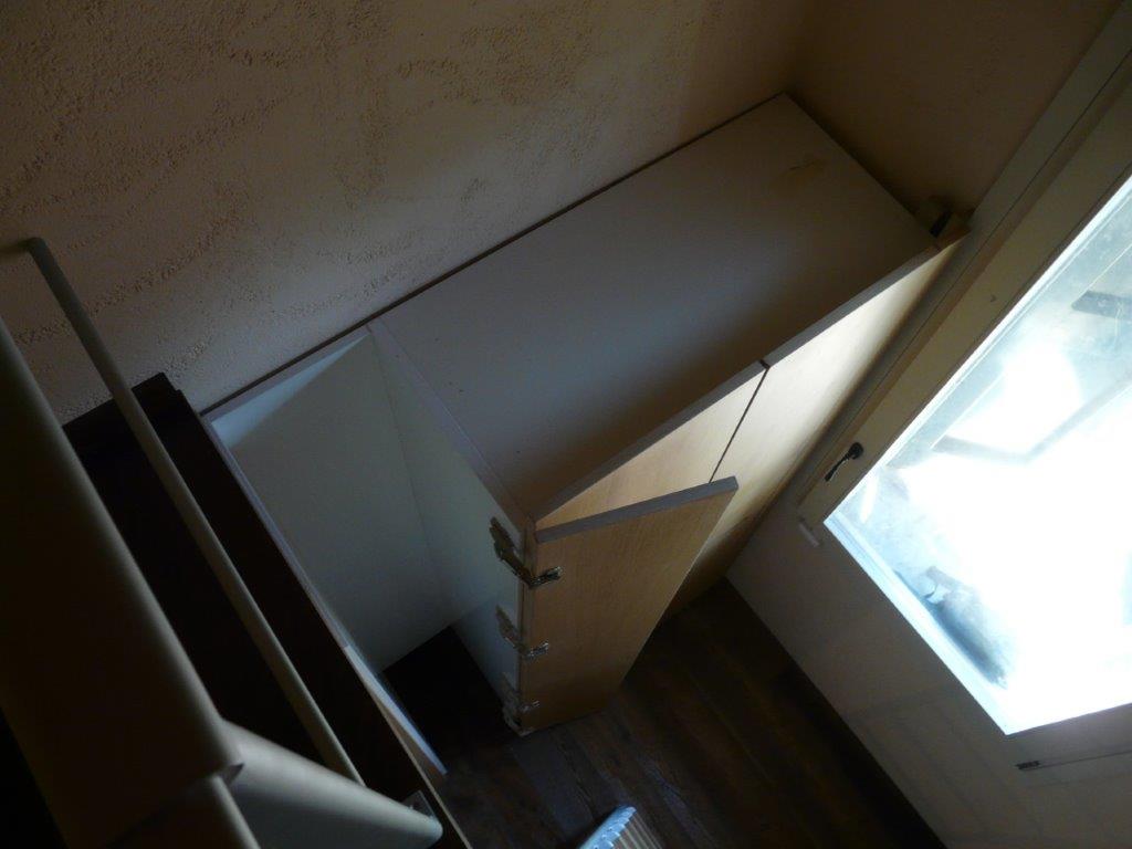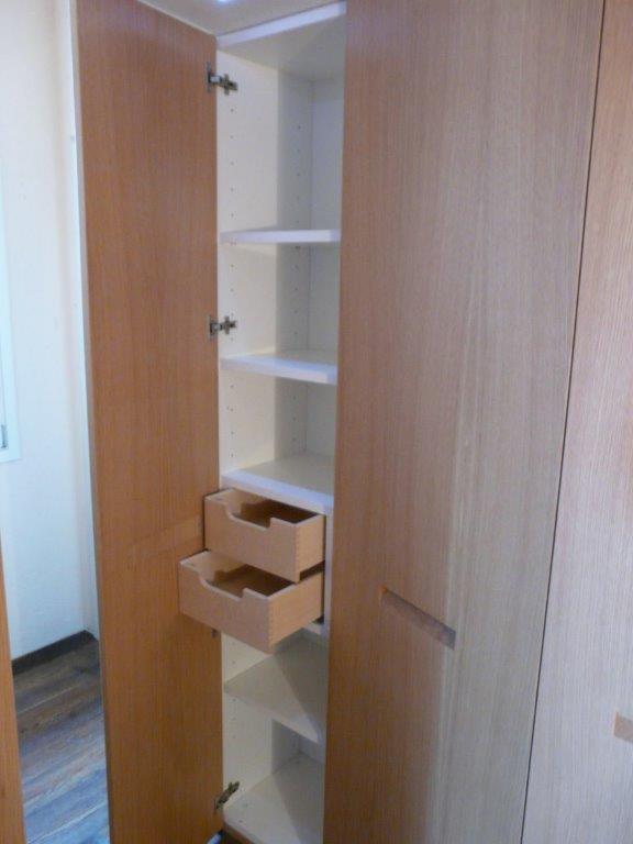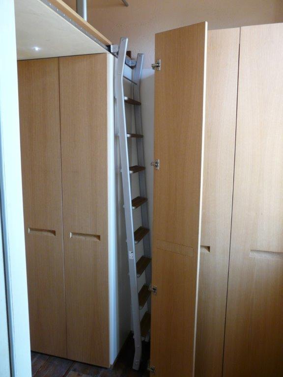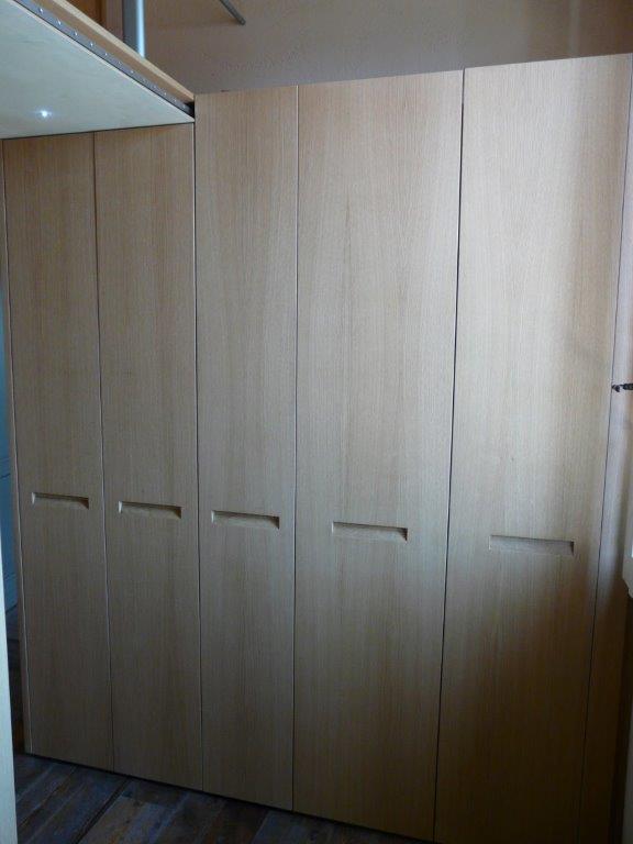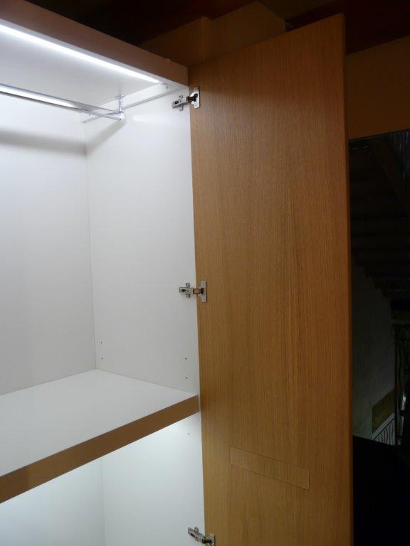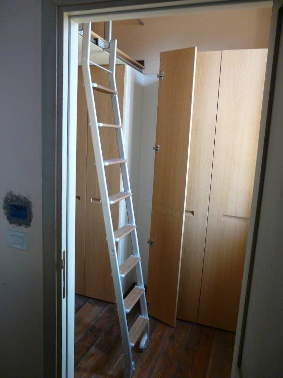Armadiatura su 2 livelli in rovere naturale. Maniglia incassata, scala scorrevole a scomparsa per raggiungere contenitore superiore montato su soppalco realizzato ad hoc.