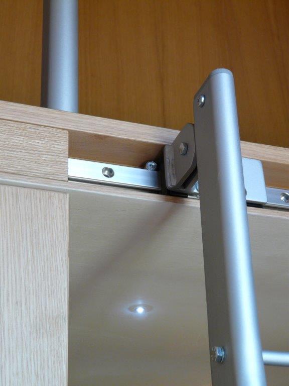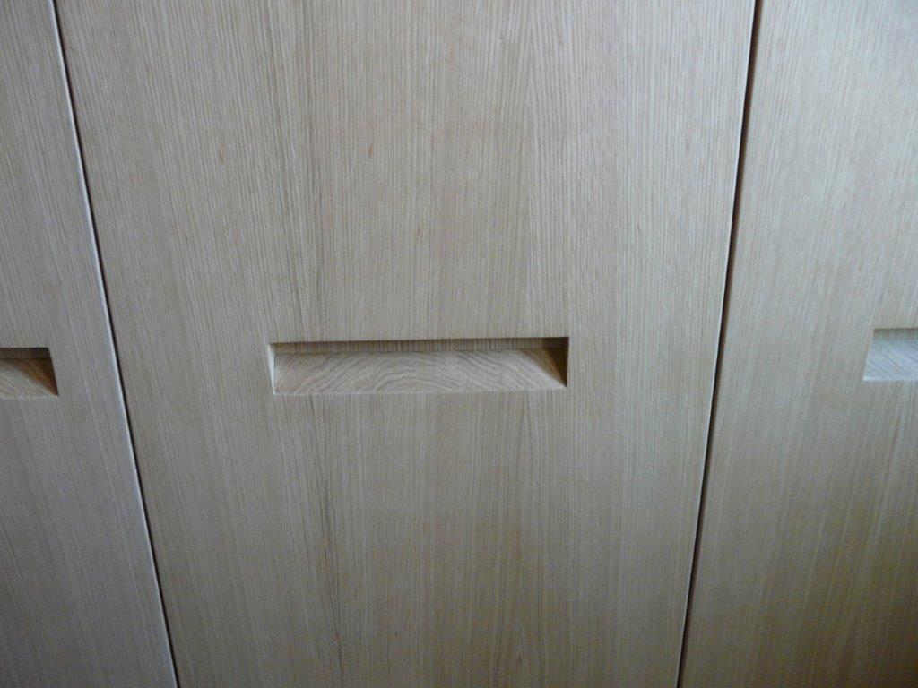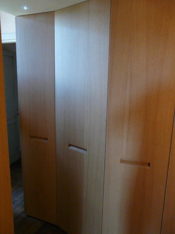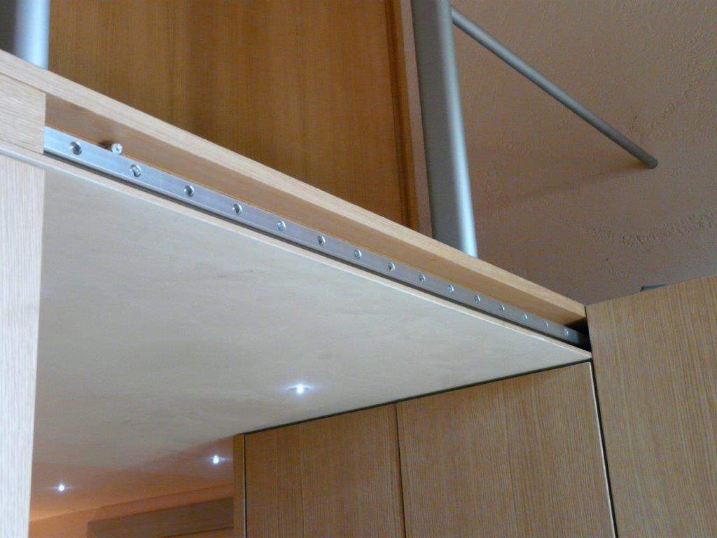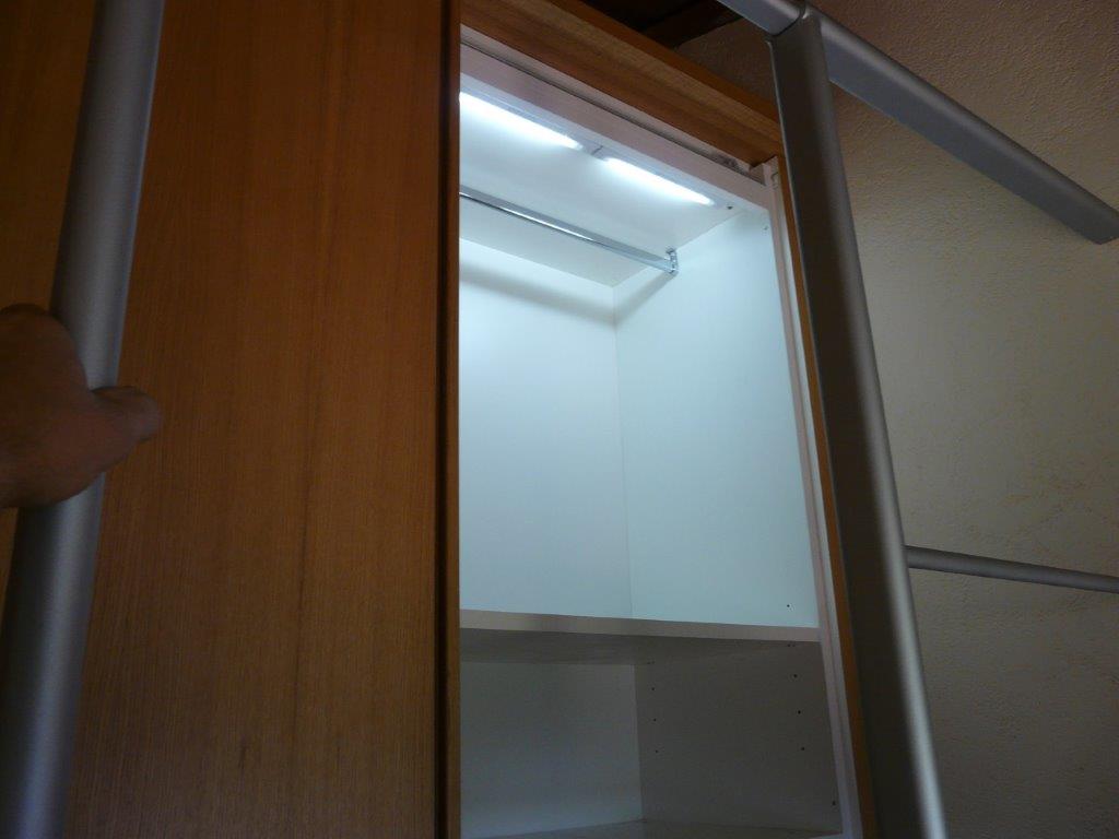 Armadiatura su 2 livelli in rovere naturale. Maniglia incassata, scala scorrevole a scomparsa per raggiungere contenitore superiore montato su soppalco realizzato ad hoc.